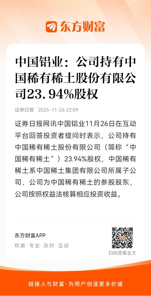 证券日报网讯中国铝业11月26日在互动平台回答投资者提问时表示,公司持有中国稀有稀土股份有限公司(简称“中国稀有稀土”)23.94%股权,中国稀有稀土系中国稀土集团有限公司所属子公司,公司为中国稀有稀土的参股股东,公司按照权益法核算相应投资收益。