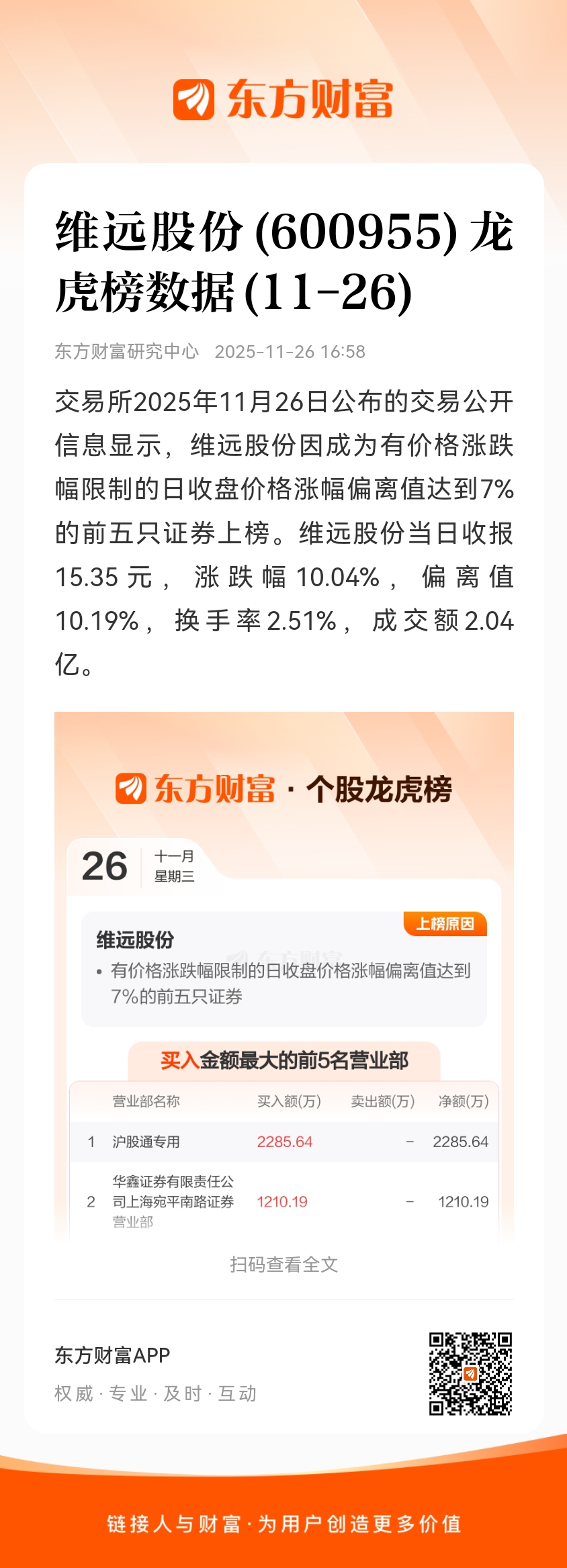 交易所2025年11月26日公布的交易公开信息显示,维远股份因成为有价格涨跌幅限制的日收盘价格涨幅偏离值达到7%的前五只证券上榜。维远股份当日收报15.35元,涨跌幅10.04%,偏离值10.19%,换手率2.51%,成交额2.04亿。