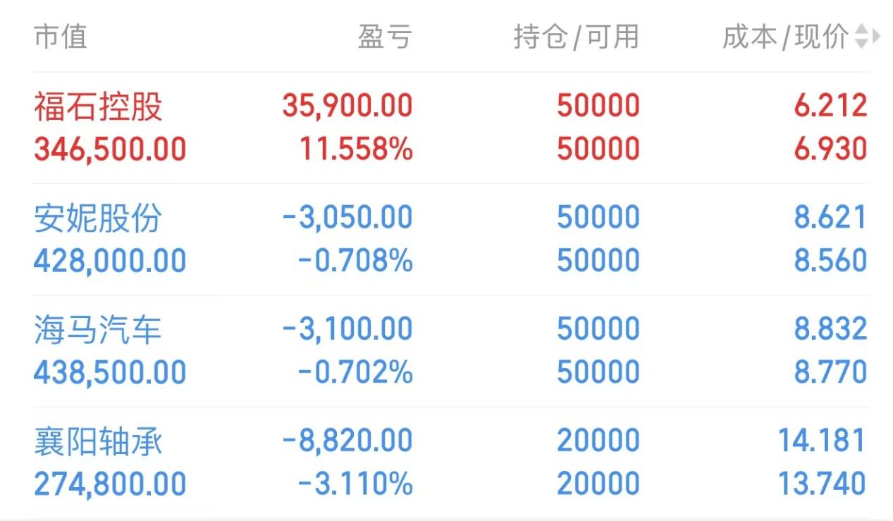 今天的手里持仓目前都是在成本附近, $福石控股(SZ300071)$ 还有一定的利润空间,但是它也已经开始进入调整,今天如果不能反弹我还是保留口喝汤的权利,再走弱真不能再拿了。