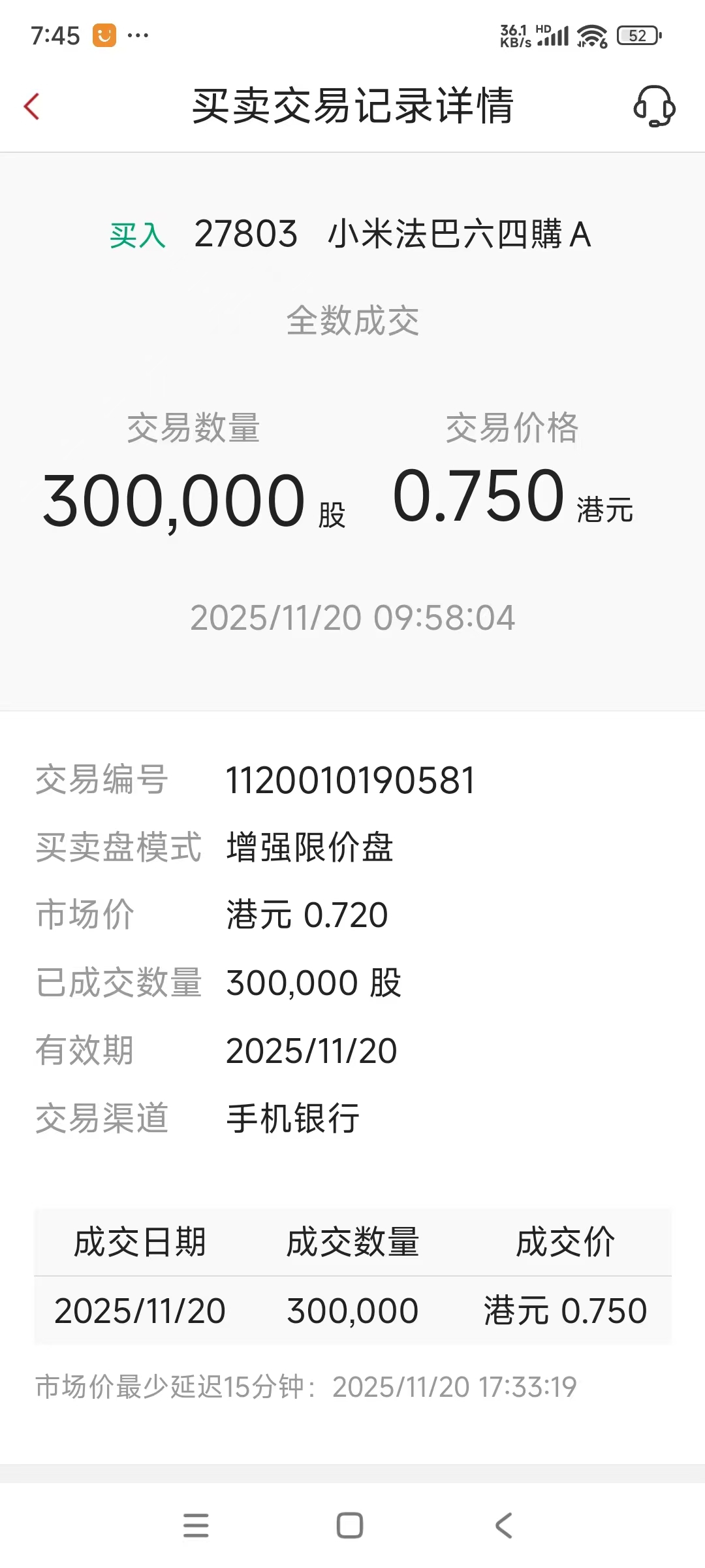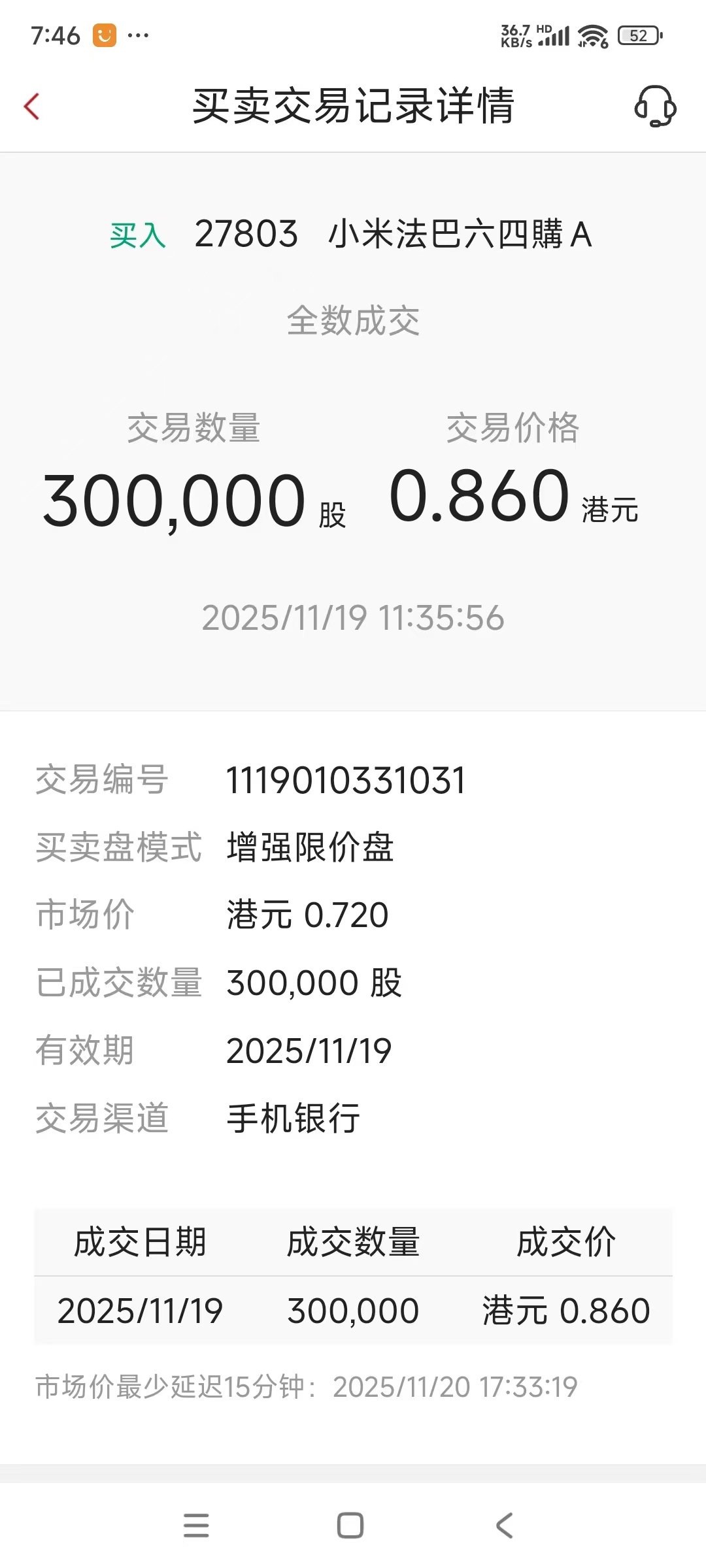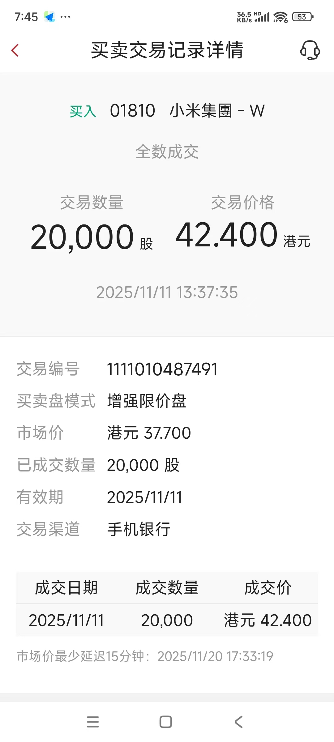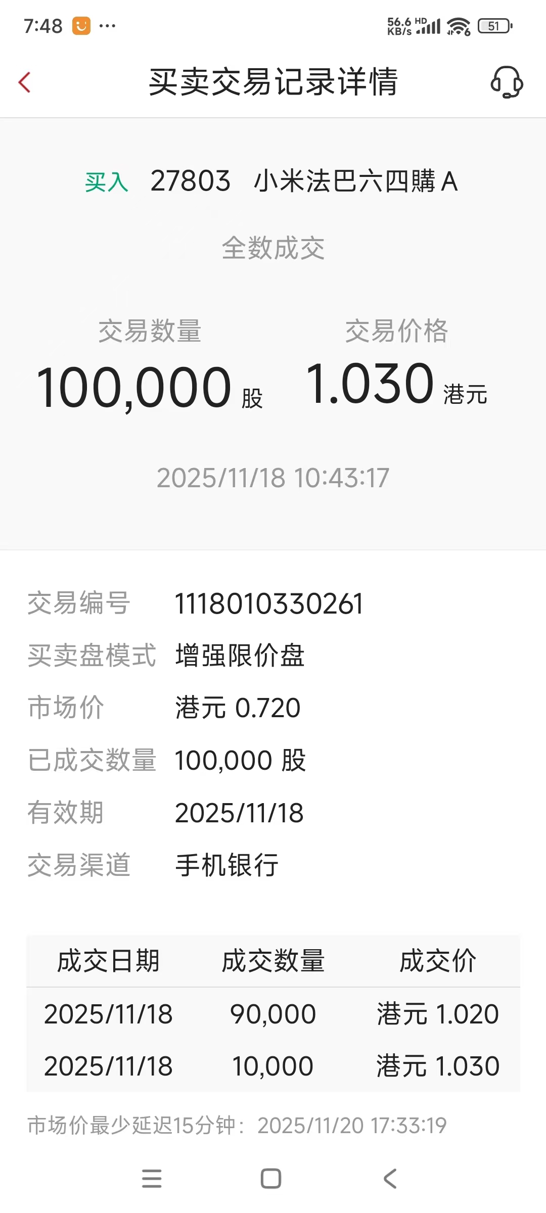 说实话赚钱真的不容易,主要是能确认的,值得下重注的机会不多。60元的时侯我也感觉小米要回调了,毕竟树不可能长上天。但没想到黑子们通过极大的努力和无所不用其极的手段,居然可以打到36元多,爆了二个牛证输了我六万多。安全点进认购权证和正股。四万股小米,一百万股小米法巴认购权证,共耗二百五拾二万五千九百元,再加一万多的手续费。就这样吧,十分感谢空军同志们的努力,万分感谢黑子们的勤奋工作,丨