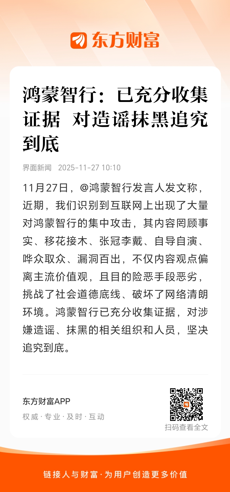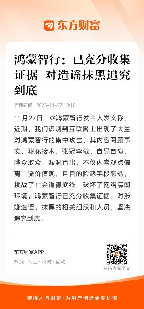 11月27日,@鸿蒙智行发言人发文称,近期,我们识别到互联网上出现了大量对鸿蒙智行的集中攻击,其内容罔顾事实、移花接木、张冠李戴、自导自演、哗众取众、漏洞百出,不仅内容观点偏离主流价值观,且目的险恶手段恶劣,挑战了社会道德底线、破坏了网络清朗环境。鸿蒙智行已充分收集证据,对涉嫌造谣、抹黑的相关组织和人员,坚决追究到底。