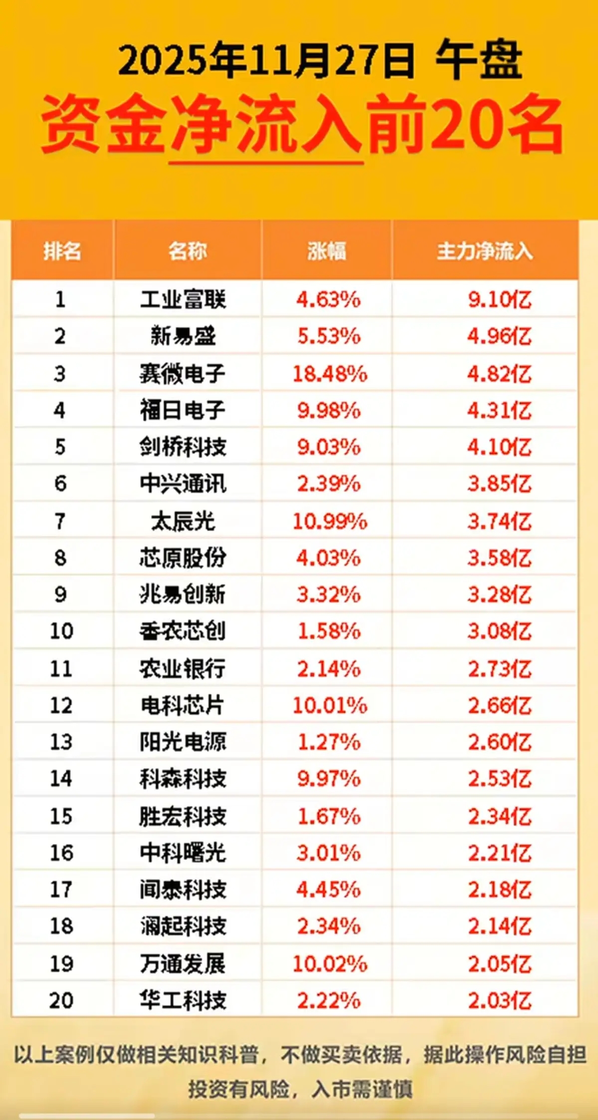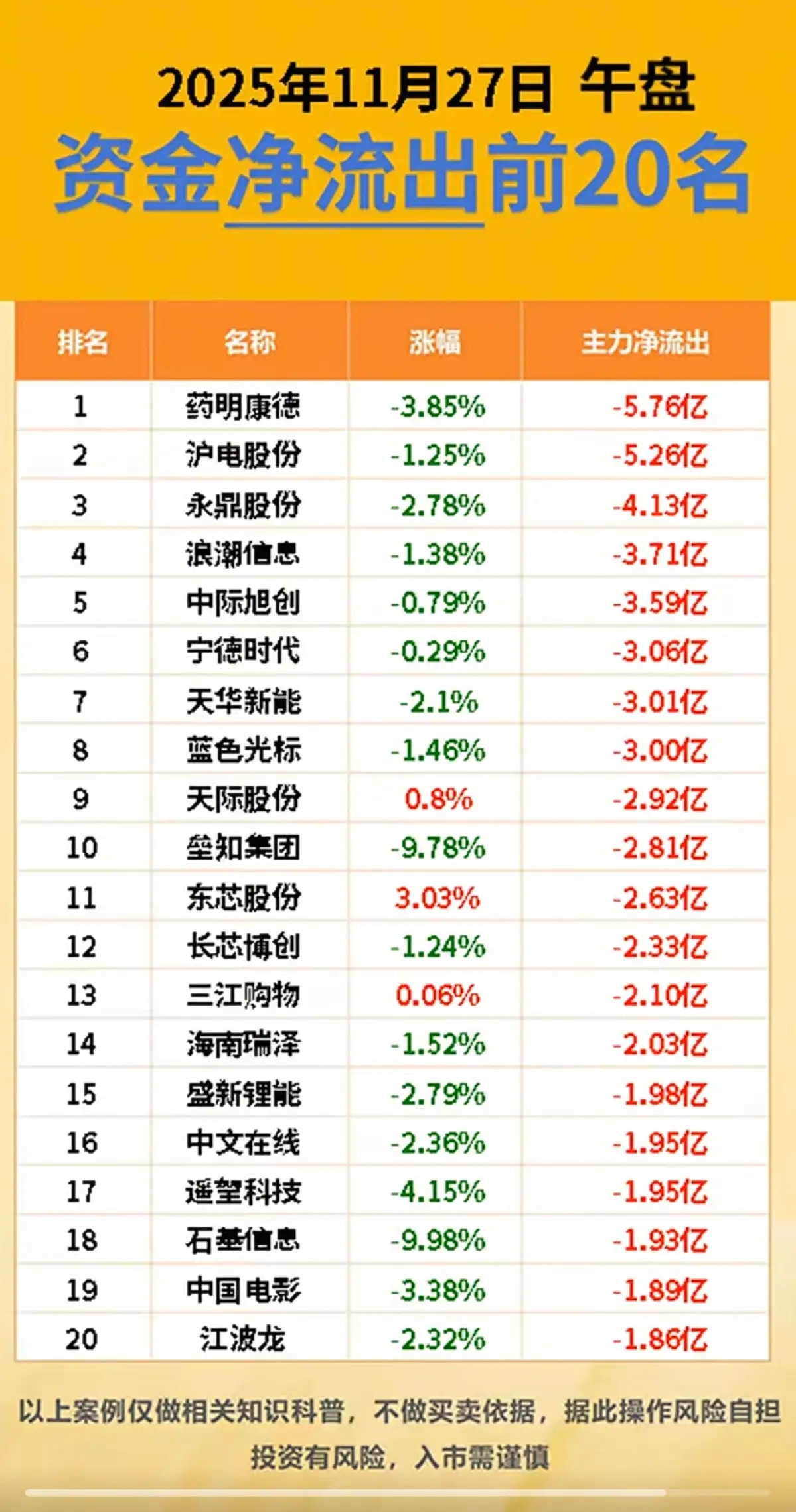11.27(周四)主力资金流向TOP20:科创板次新领涨,这些板块获资金猛加仓!