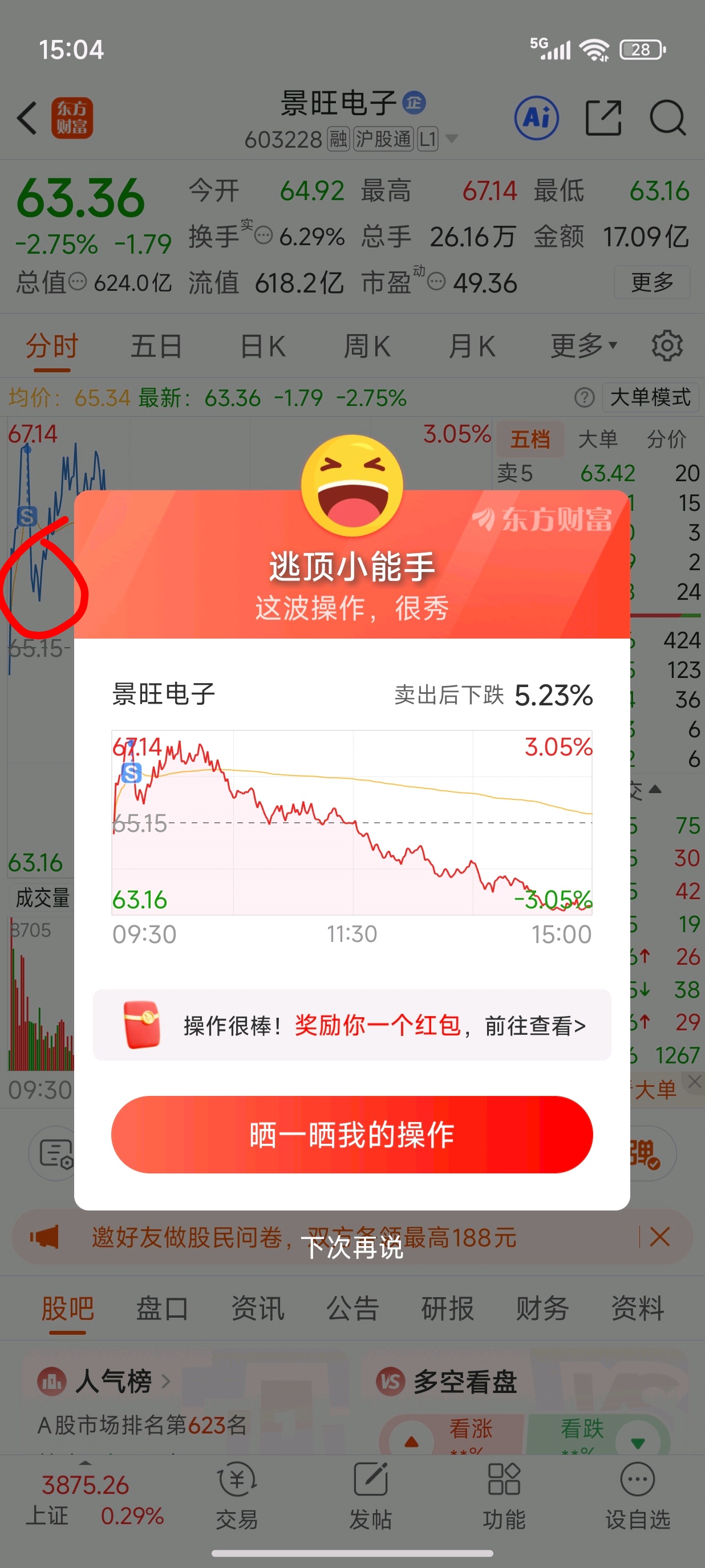 #炒股日记# 今天终于没有卖飞了,跌下去又涨起来的时候,还后悔红圈那个位置没买回来。