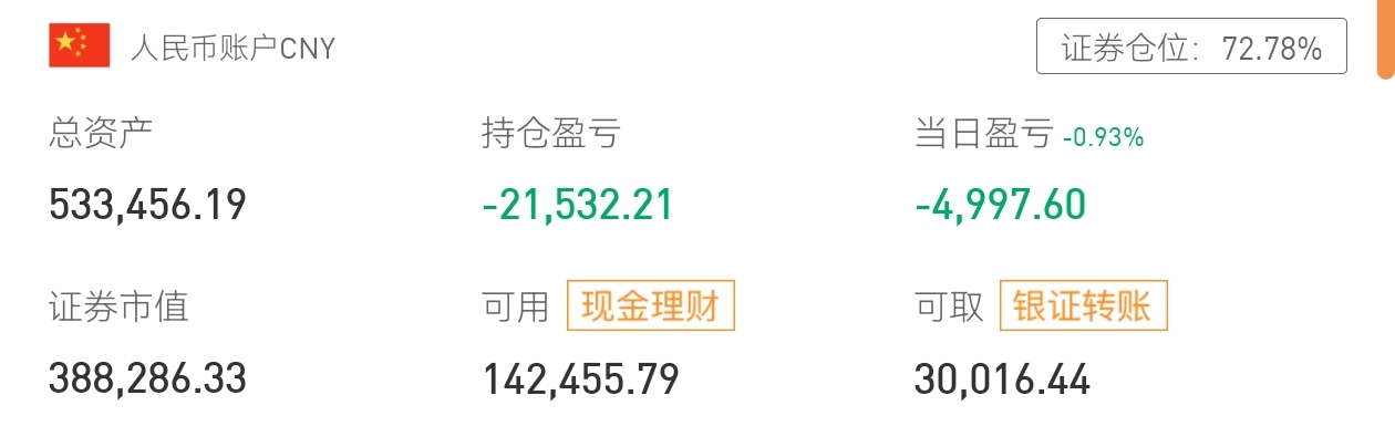 1127收市证券持仓近七成,小幅浮亏但现金充裕,灵活配置静待时机。