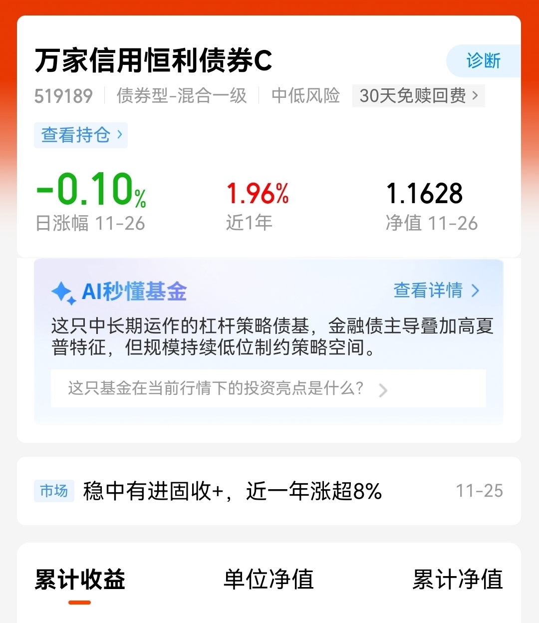 权益波动大,投资债券基金风险小,长期值得配置点,挺好的。$万家信用恒利债券C$
