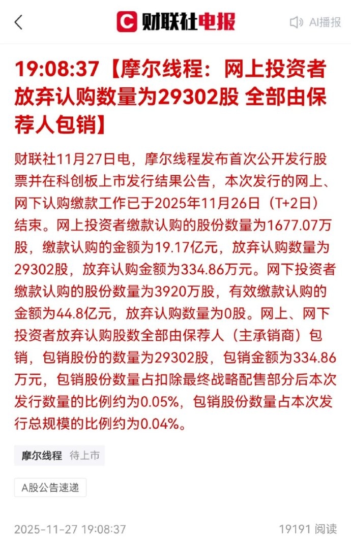 摩尔线程,竟然有1667万股被放弃认购!林子大了什么鸟都有!包销商估计都要笑翻了