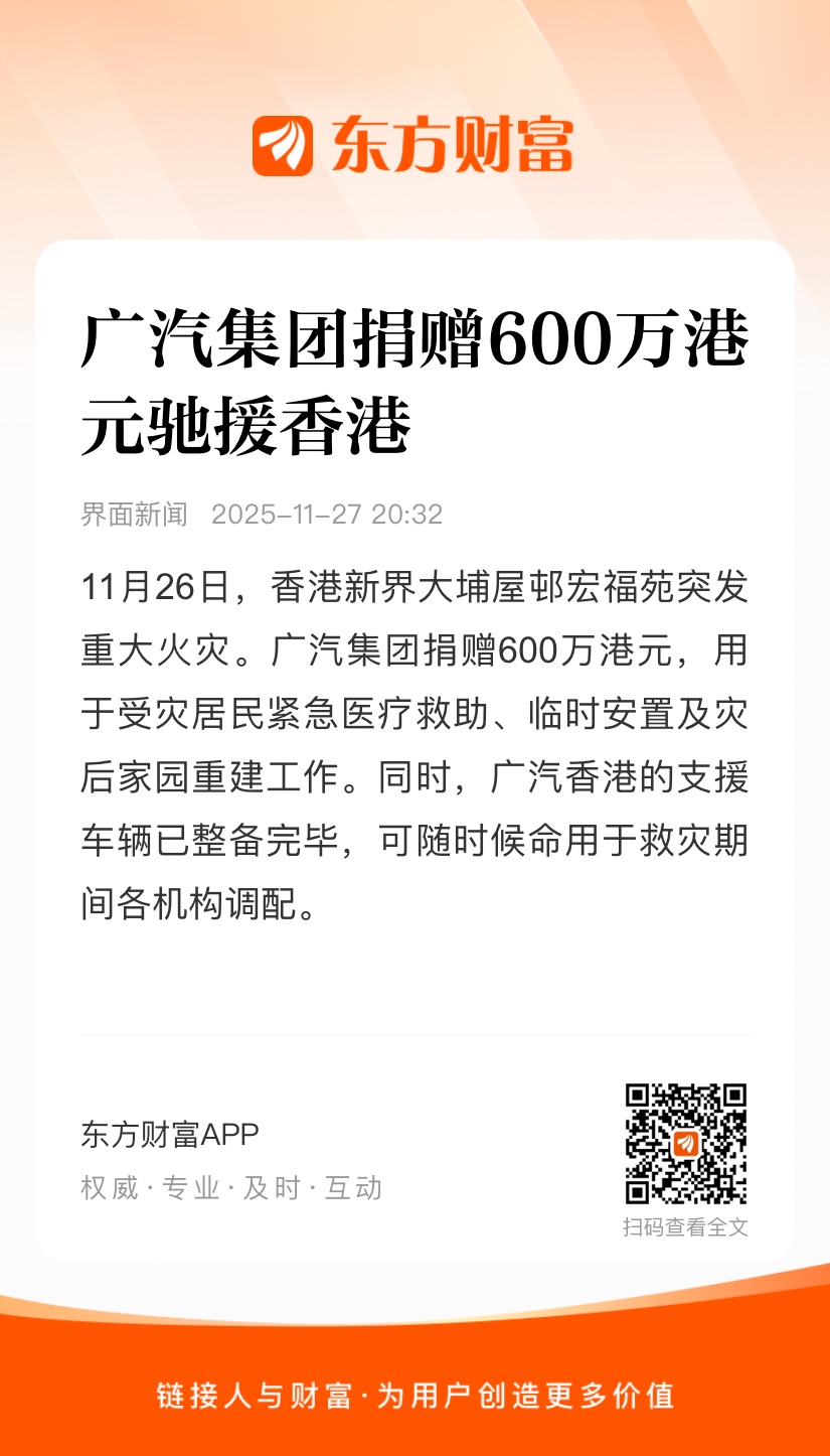 11月26日,香港新界大埔屋邨宏福苑突发重大火灾。广汽集团捐赠600万港元,用于受灾居民紧急医疗救助、临时安置及灾后家园重建工作。同时,广汽香港的支援车辆已整备完毕,可随时候命用于救灾期间各机构调配。