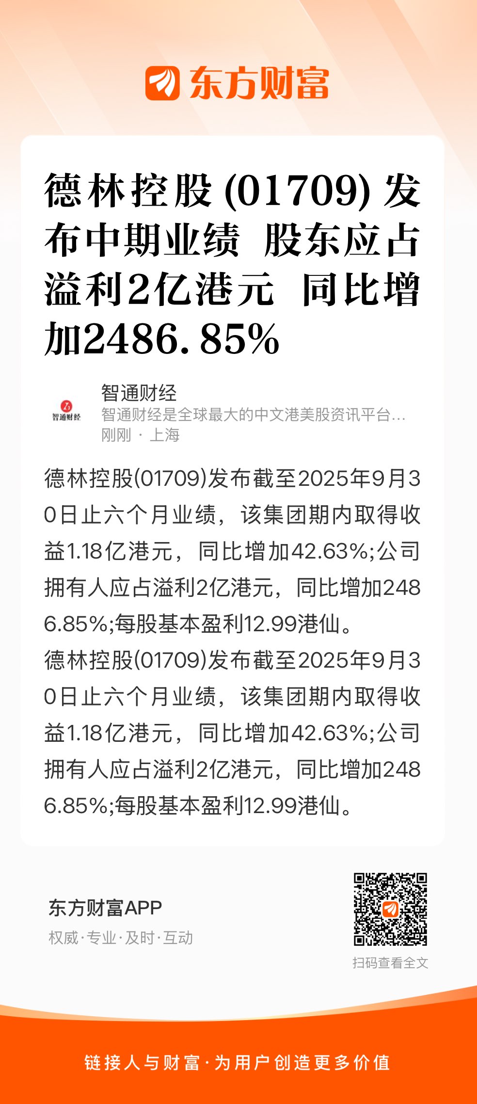 德林控股(01709)发布截至2025年9月30日止六个月业绩,该集团期内取得收益1.18亿港元,同比增加42.63%;公司拥有人应占溢利2亿港元,同比增加2486.85%;每股基本盈利12.99港仙。