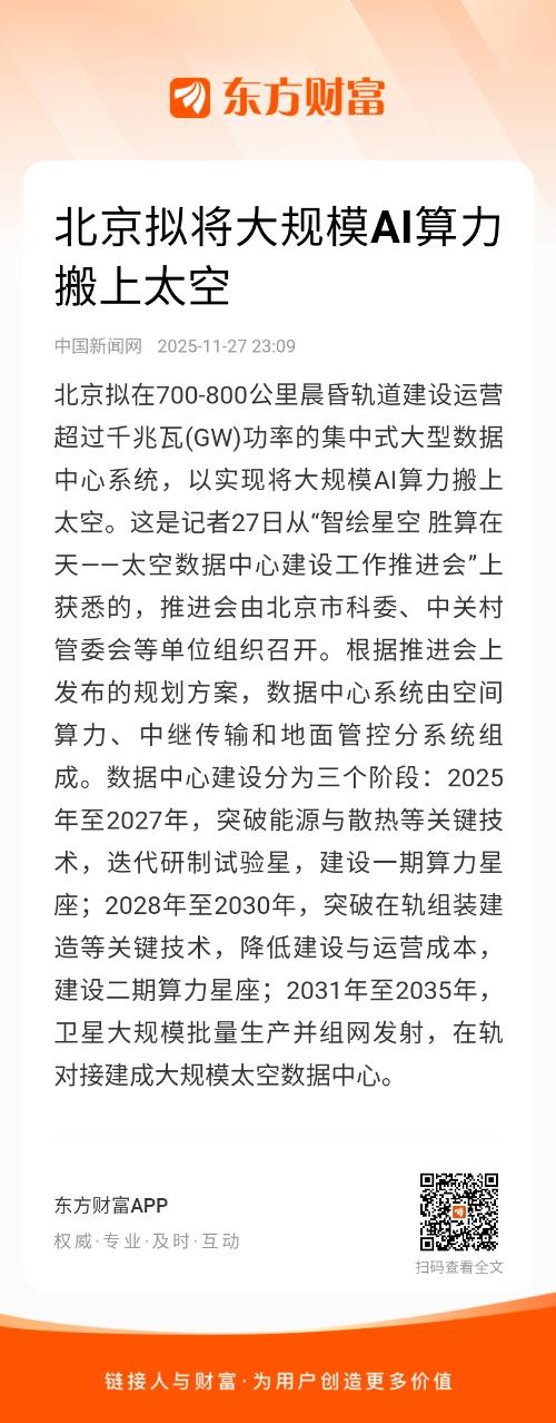 北京拟在700-800公里晨昏轨道建设运营超过千兆瓦(GW)功率的集中式大型数据中心系统,以实现将大规模AI算力搬上太空。