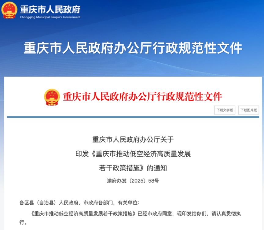 日前,重庆市人民政府办公厅印发《重庆市推动低空经济高质量发展若干政策措施》(以下简称《政策措施》),从三个方面提出了17条具体举措推动低空经济高质量发展。