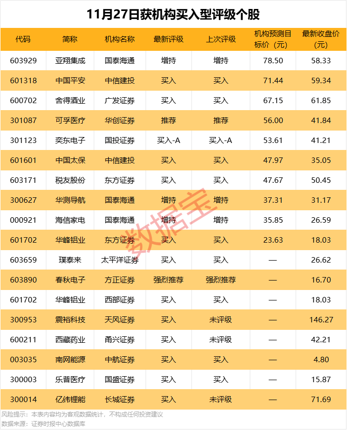其中,中国太保上涨空间最高,11月27日中信建投预计公司目标价为47.97元,上涨空间达36.86%。上涨空间较高的个股还有海信家电、亚翔集成,分别为34.83%、34.58%。