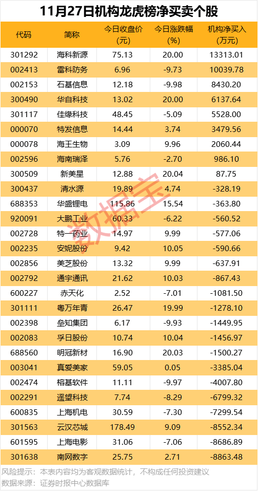今日龙虎榜中,净买入个股有9只,净卖出的个股为19只。7股净买入金额均超2000万元,海科新源、雷科防务获机构净买入均超1亿元,居前;石基信息、华自科技、佳缘科技获机构净买入均超5000万元。
