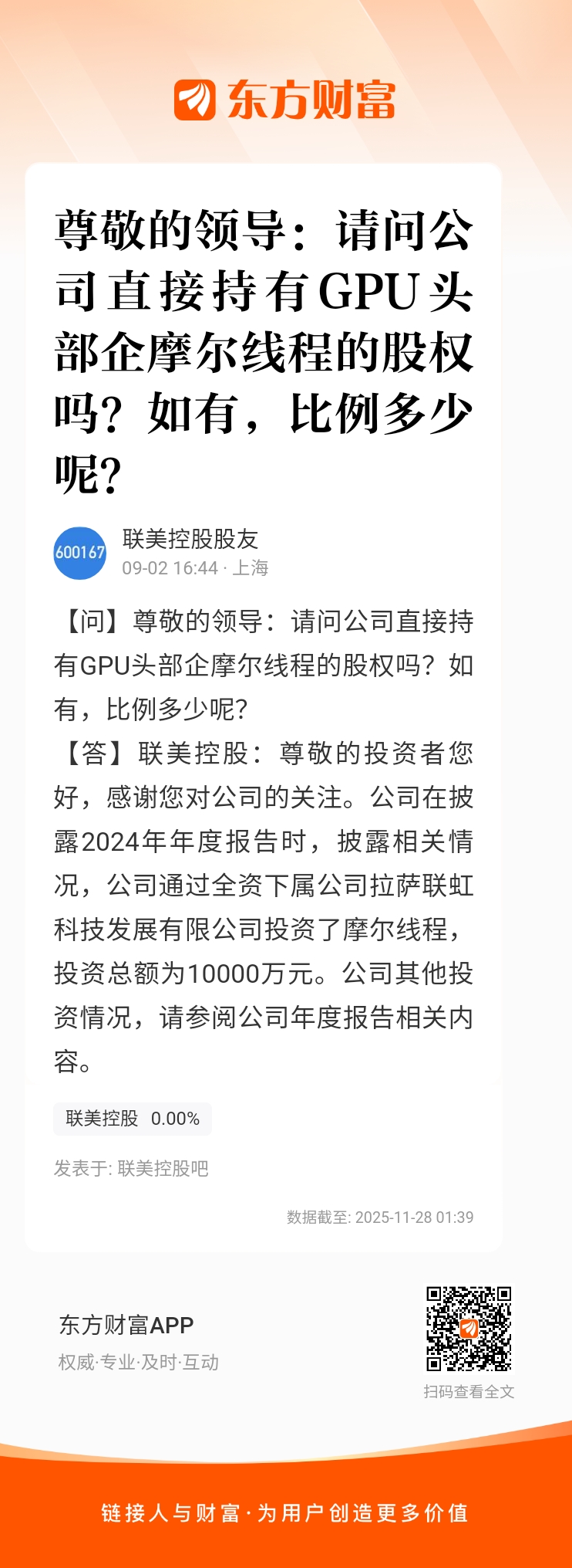 尊敬的领导:请问公司直接持有GPU头部企摩尔线程的股权吗?如有,比例多少呢?