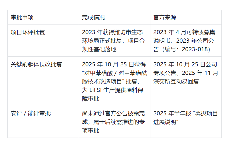官方表述:“LiFSI 项目仍处于前期筹备阶段,具体建设进度将根据前驱体进展及市场需求动态调整”(来源:2025 年 11 月 20 日深交所互动易回复)。