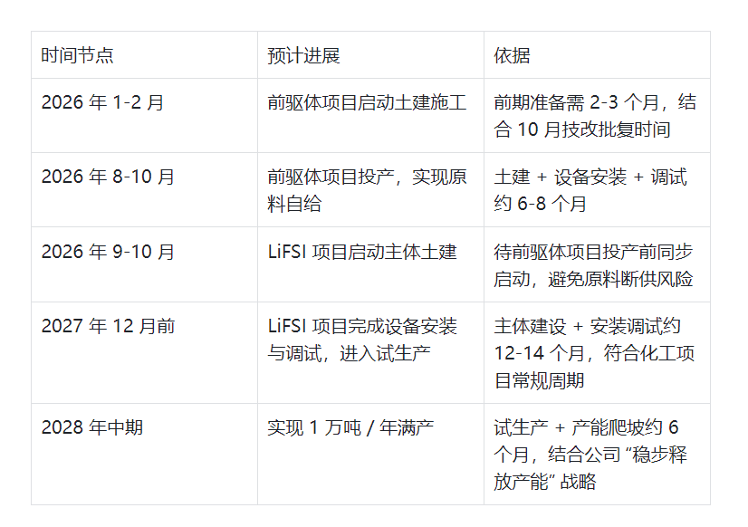 时间逻辑:前驱体项目建设周期预计 6-8 个月,需完成建设并投产后方能为 LiFSI 项目提供稳定原料(来源:化工项目建设行业常规周期推导,结合公司 “先前驱体、后 LiFSI” 战略表述)。