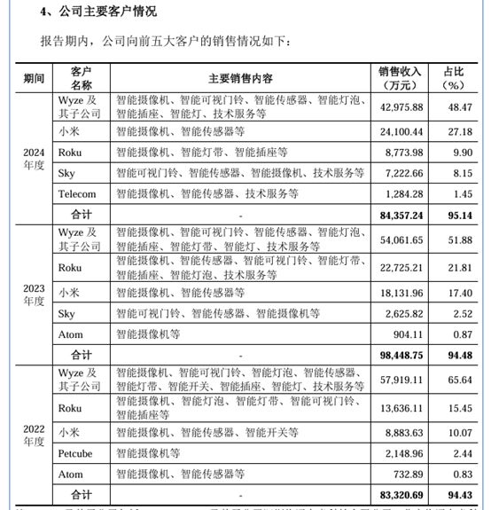 Wyze公司是华来科技第一大客户。2022年—2024年(以下简称报告期),华来科技来自于前五大客户的收入分别占其当期总营收94.43%、94.48%和 95.14%,集中度较高。其中,来自Wyze 公司及其子公司的销售收入分别占华来科技当期营收的65.64%、51.88%和 48.47%,尽管比例有所下降,但依赖程度依然较高。
