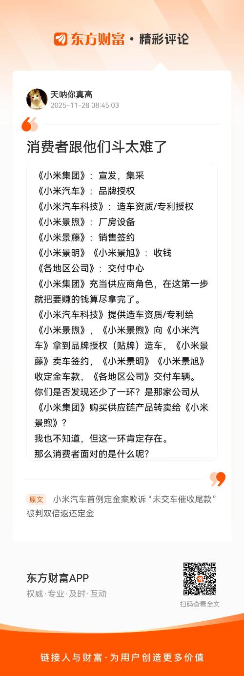 需要指出的是,小米汽车“未交车先催全款”的做法与汽车消费领域普遍惯例不符,传统车企多采用“付定金+提车时结清尾款”的模式,流程为车辆到店、消费者验车、支付尾款,最后完成交付。这一惯例建立在长期市场实践基础上,能有效保障交易公平。