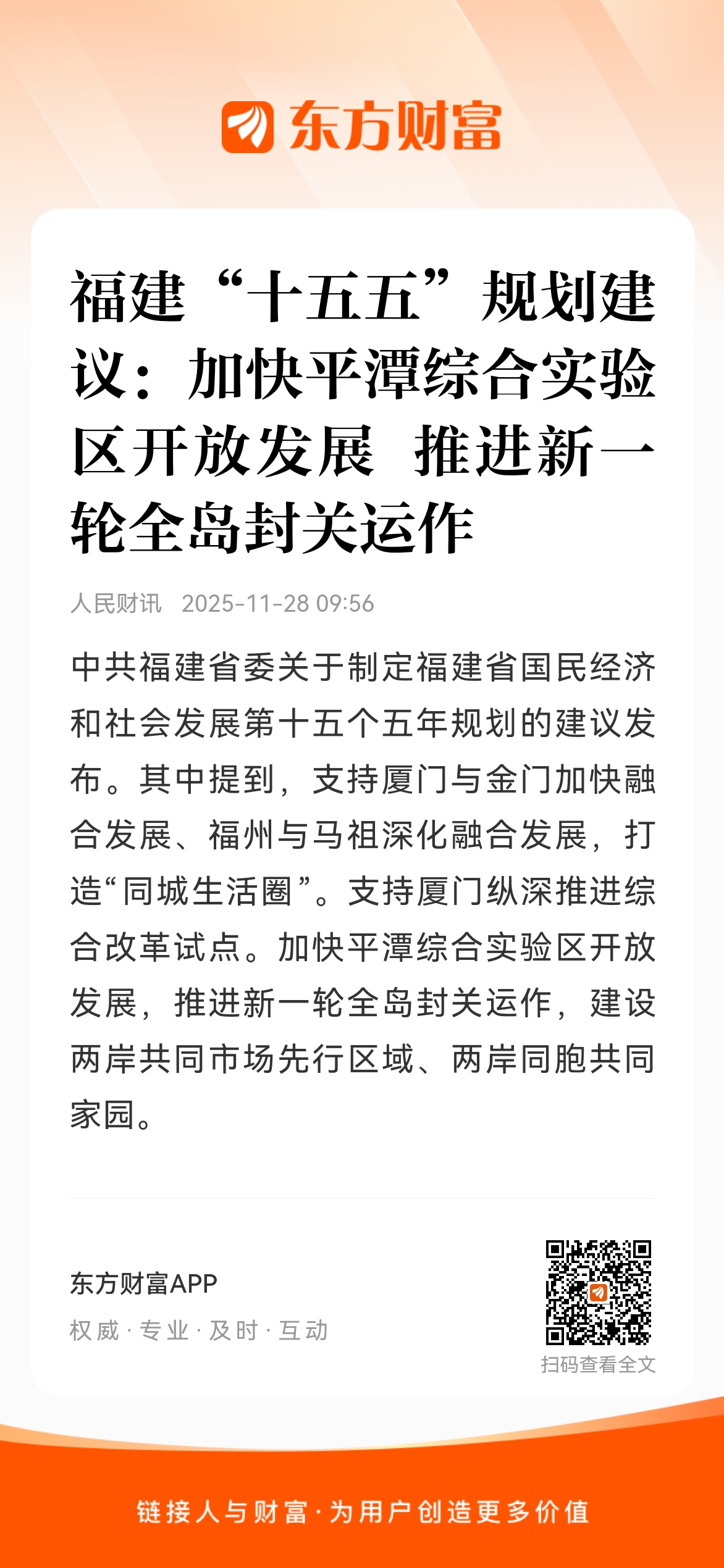 中共福建省委关于制定福建省国民经济和社会发展第十五个五年规划的建议发布。其中提到,支持厦门与金门加快融合发展、福州与马祖深化融合发展,打造“同城生活圈”。支持厦门纵深推进综合改革试点。加快平潭综合实验区开放发展,推进新一轮全岛封关运作,建设两岸共同市场先行区域、两岸同胞共同家园。健全福州新区与平潭综合实验区对台融合协同机制,实现一体化、高质量发展。支持其他地区建好用好对台交流合作平台载体,打造富有特色的对台合作品牌。