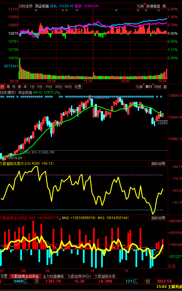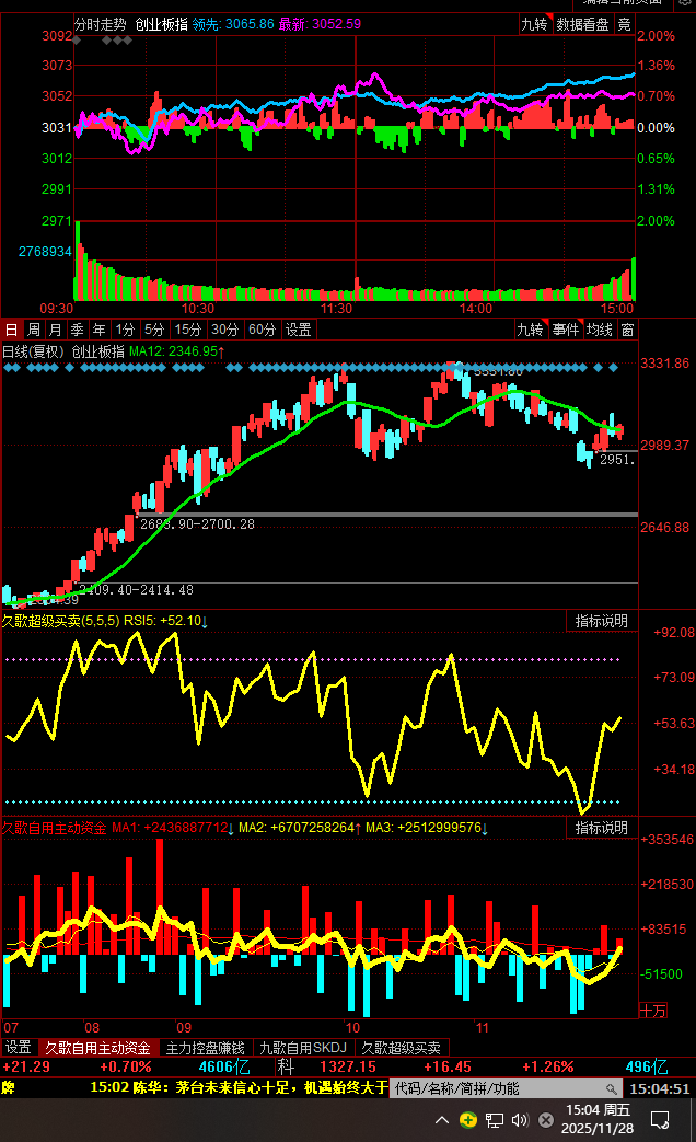 从2大指数位置图上可以看出,下周会有2个大涨的交易日出现;这种3大指数全天以主动买进为主的日子并不多见,今天算破例了,但是,大涨,不等于普涨,没有主力光顾的要么只会小涨,更多没有主力参与的个股还会在其它股大涨的时候,继续出现下跌,甚至是大跌,所以说,炒股一定要跟随主力资金走,否则,只能在股市里亏光自己所有的血汗本钱。