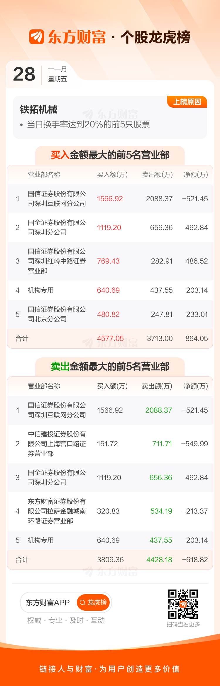 交易所2025年11月28日公布的交易公开信息显示,铁拓机械因成为当日换手率达到20%的前5只股票上榜。铁拓机械当日收报28.13元,涨跌幅9.16%,偏离值23.49%,换手率23.49%,成交额2.69亿。