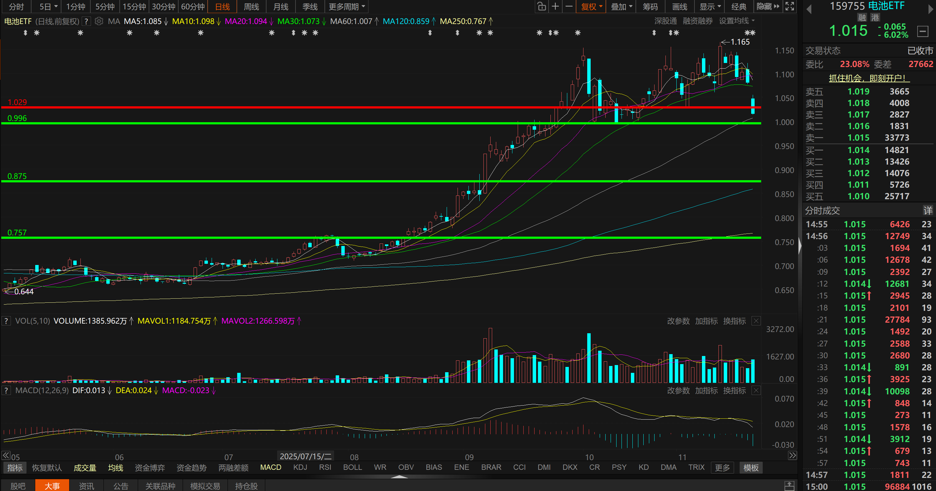3、电池ETF(159755),关注日线支撑0.996。