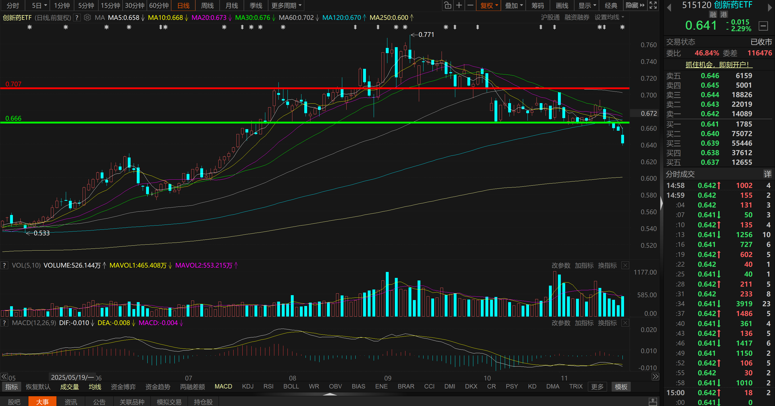 4、创新药ETF(515120),只要没重新站上0.666,短期形态偏空。