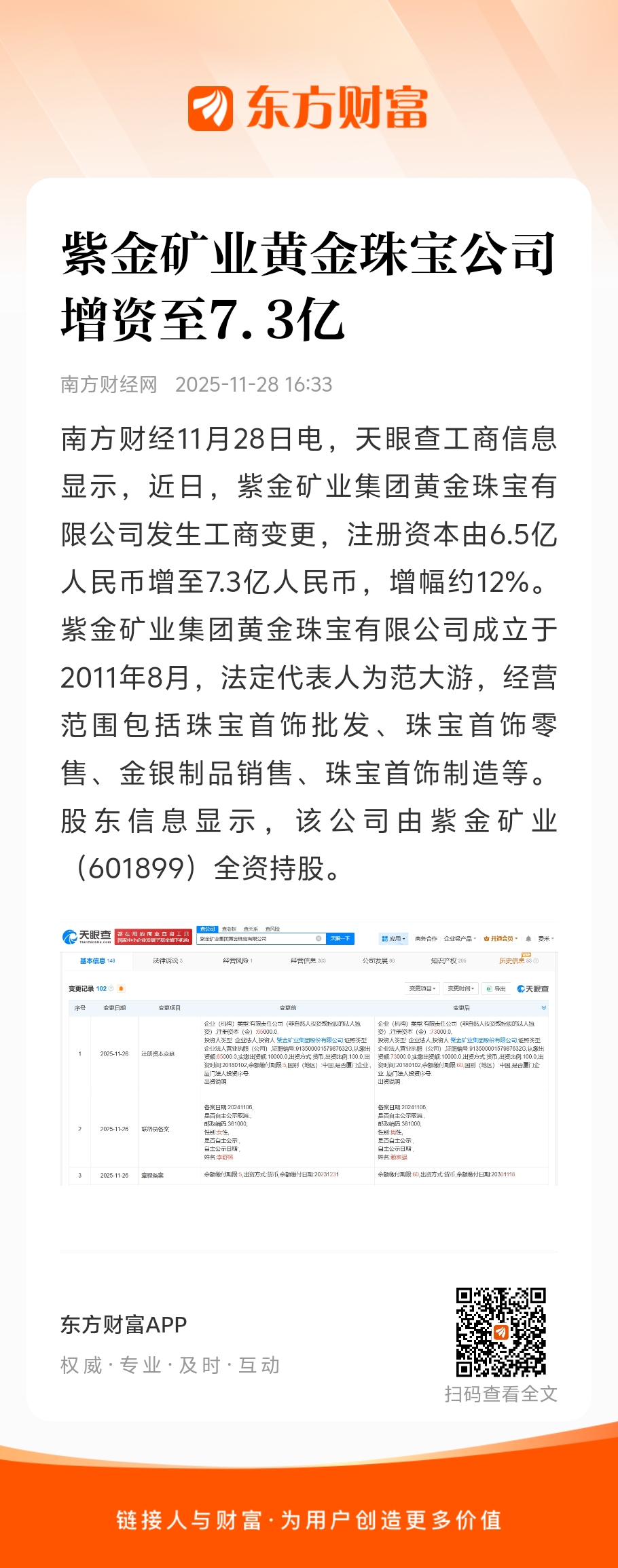 南方财经11月28日电,天眼查工商信息显示,近日,紫金矿业集团黄金珠宝有限公司发生工商变更,注册资本由6.5亿人民币增至7.3亿人民币,增幅约12%。紫金矿业集团黄金珠宝有限公司成立于2011年8月,法定代表人为范大游,经营范围包括珠宝首饰批发、珠宝首饰零售、金银制品销售、珠宝首饰制造等。股东信息显示,该公司由紫金矿业(601899)全资持股。