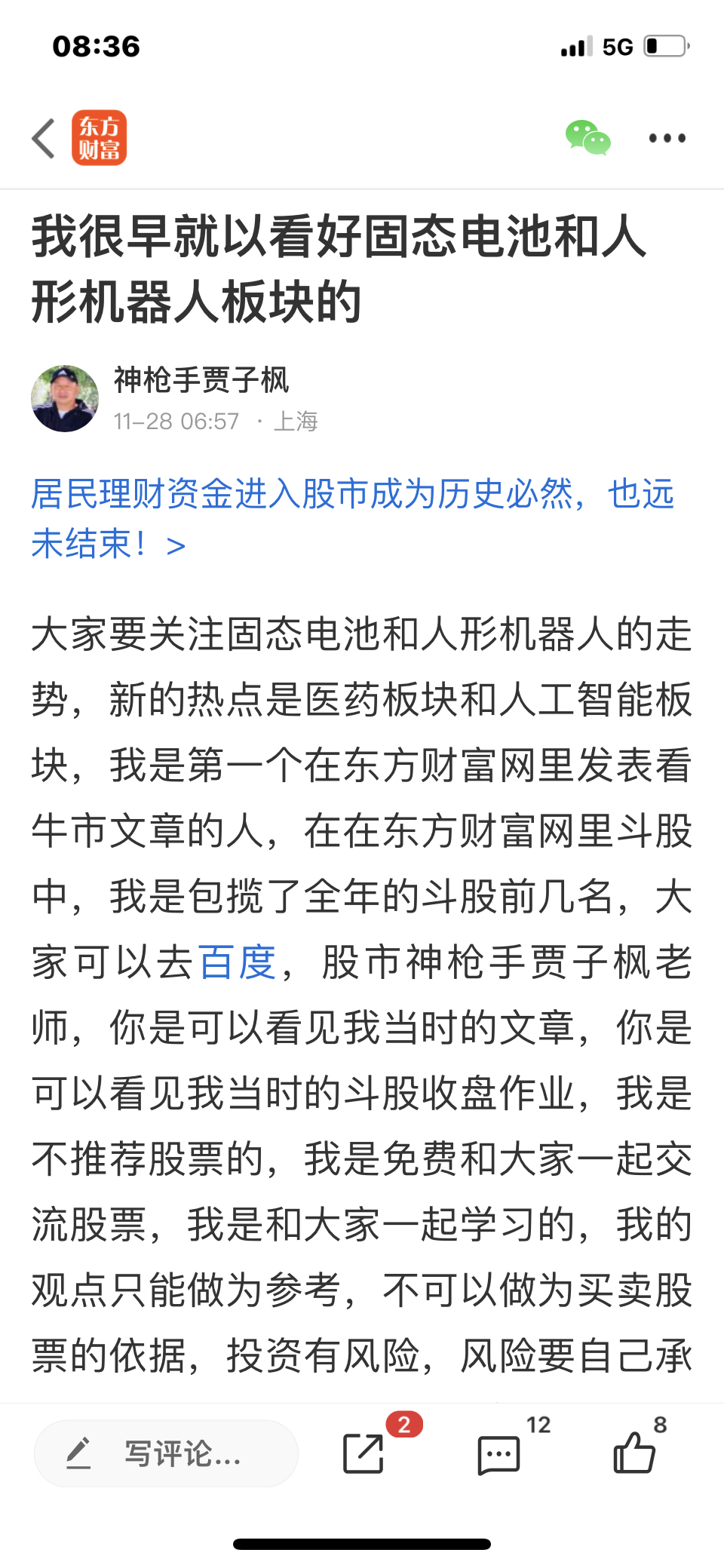 我对周一的大盘是看震荡上涨的,大家热点是固态电池板块和人工智能板块,大家要关注板块中的龙头股,我是不推荐股票的,我是在东方财富网里的斗股中,我是包揽了全年的前几名,我是在东方财富网第一个发表看牛市的人,大家可以去百度,股市神枪手贾子枫老师,你是可以看见了我当时的文章,你可以看见我每天的收盘作业,你可以看见我以前做过的妖股,我是不推荐股票的,我是免费和大家一起交流股票,我是和大家一起学习的,我的观点只能做为参考,不可以做为买卖股票的依据,投资有风险,风险要自己承担后果,人在做天在看,好人一生平安,是金子总会发光的。
