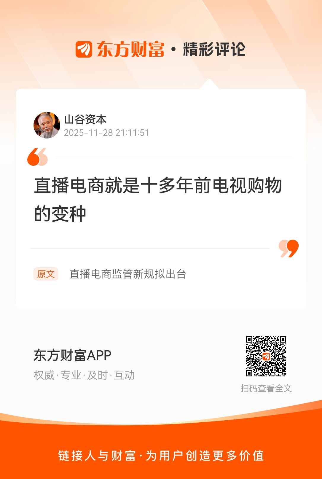 直播电商就是十多年前电视购物的变种 ,十多年前是被限制和严格约束的,不知道什么时候却大行其道。飞机、火箭、航空航天、新能源汽车、高铁...高科技产业怎么发展都是正确的,而承载着大量文化水平不高的就业人群的零售、百货等产业却被资本和极少数网红挤压的没有生存空间,财富集中到极少数人手中是彻彻底底的错误我在《直播电商监管新规拟出台》的评论获得了大家的关注。