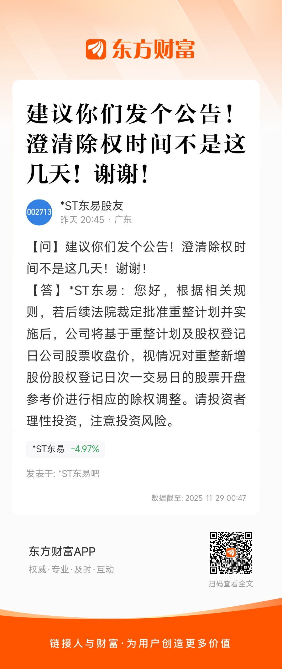 建议你们发个公告!澄清除权时间不是这几天!谢谢!
