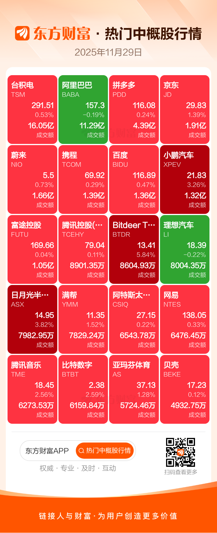 台积电涨0.53%,阿里巴巴跌0.19%,拼多多涨0.24%,京东涨1.39%,蔚来涨0.73%,携程涨0.29%,百度涨0.47%,小鹏汽车涨3.26%,富途控股涨0.04%,腾讯控股(ADR)涨0.11%。