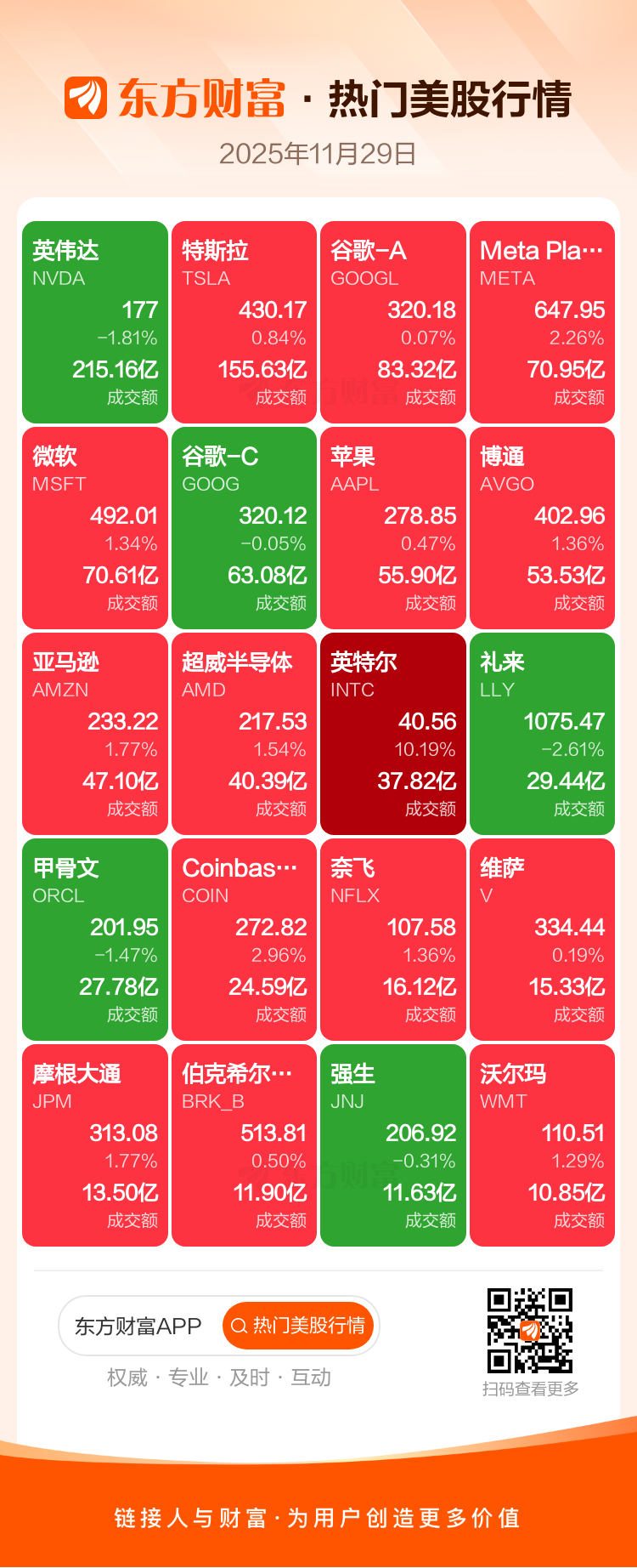 英伟达跌1.81%,特斯拉涨0.84%,谷歌-A涨0.07%,Meta Platforms Inc-A涨2.26%,微软涨1.34%,谷歌-C跌0.05%,苹果涨0.47%,博通涨1.36%,亚马逊涨1.77%,超威半导体涨1.54%。