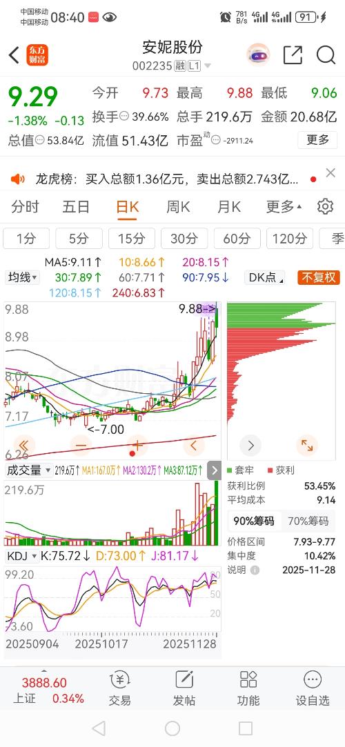 交易所2025年11月28日公布的交易公开信息显示,安妮股份因成为日换手率达到20%的前5只证券上榜。安妮股份当日收报9.29元,涨跌幅-1.38%,偏离值39.66%,换手率39.66%,成交额20.68亿。
