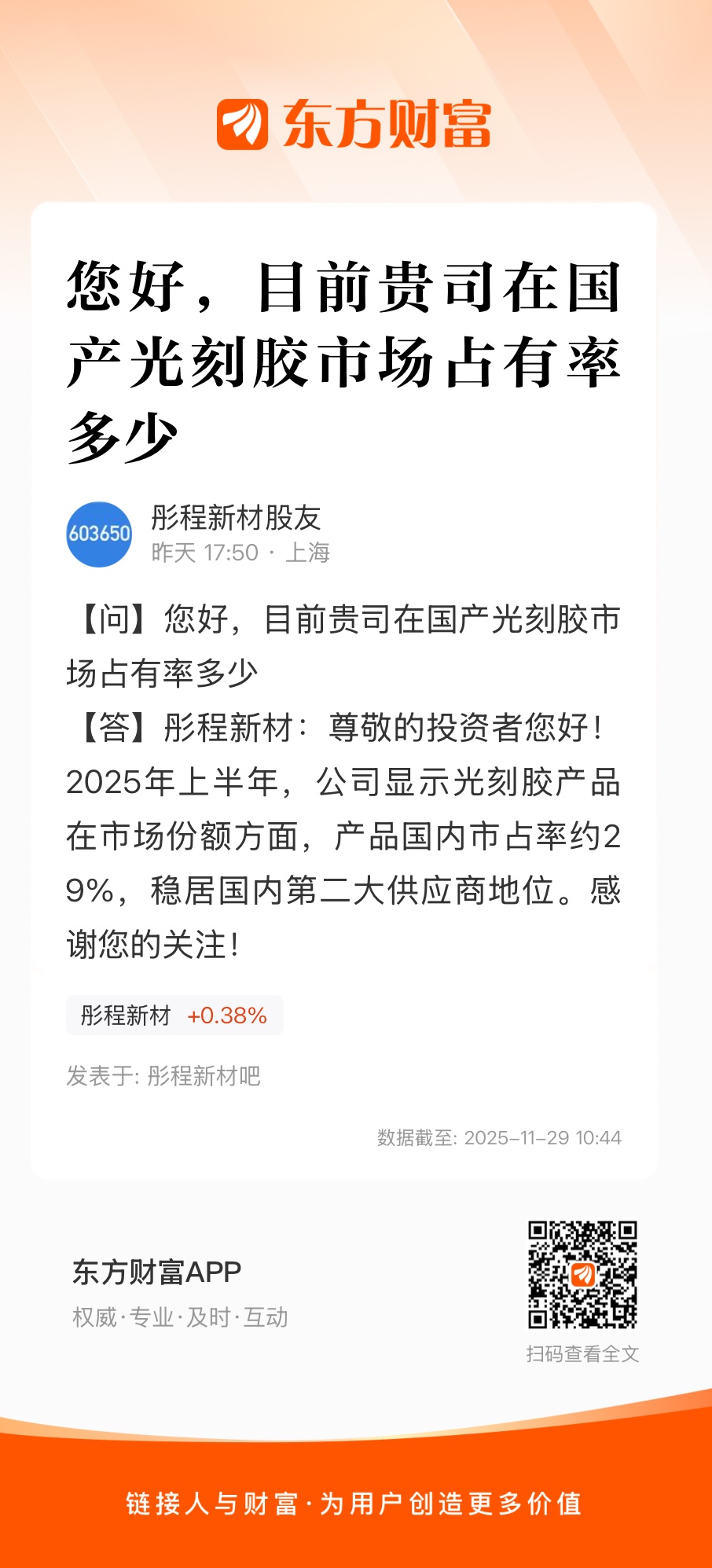 尊敬的投资者您好!2025年上半年,公司显示光刻胶产品在市场份额方面,产品国内市占率约29%,稳居国内第二大供应商地位。感谢您的关注!