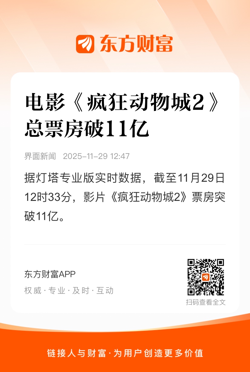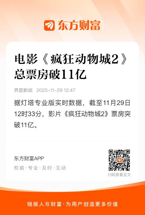 据灯塔专业版实时数据,截至11月29日12时33分,影片《疯狂动物城2》票房突破11亿。