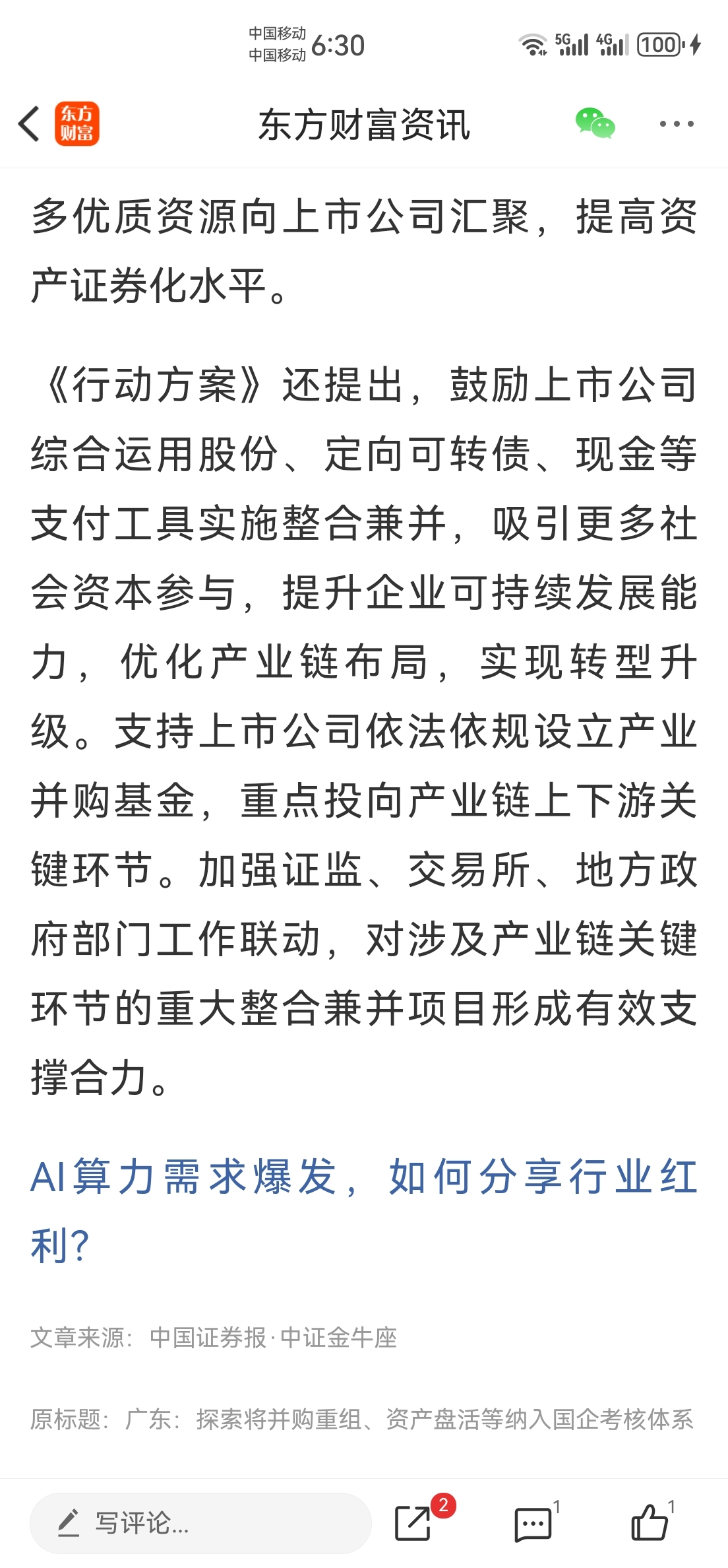 广东:探索将并购重组、资产盘活等纳入国企考核体系日前,广东省地方金融管理局、广东省发展改革委、广东省工业和信息化厅等多部门联合印发《广东省金融支持企业开展产业链整合兼并行动方案》。《行动方案》明确,到2027年,努力推动粤港澳大湾区形成产业集群优势显著提升、整合兼并服务更加高效、多元协作机制更加健全的发展格局,更好服务广东现代化产业体系建设和经济社会高质量发展。在推动国企整合兼并优质资源方面,《行动方案》提出,探索将并购重组、资产盘活等纳入国企考核体系。推动上市国企灵活运用定向增发、专项可转债、并购贷款等融资工具,用好配套募集资金储架发行制度,围绕优势领域积极开展产业链整合兼并,做强做优做大。加强国企内部资源整合,运用好现有融资平台,通过资产重组、股权置换等多种方式,推动更多优质资源向上市公司汇聚,提高资产证券化水平。《行动方案》还提出,鼓励上市公司综合运用股份、定向可转债、现金等支付工具实施整合兼并,吸引更多社会资本参与,提升企业可持续发展能力,优化产业链布局,实现转型升级。支持上市公司依法依规设立产业并购基金,重点投向产业链上下游关键环节。加强证监、交易所、地方政府部门工作联动,对涉及产业链关键环节的重大整合兼并项目形成有效支撑合力。AI算力需求爆发,如何分享行业红利?文章来源:中国证券报中证金牛座原标题:广东:探索将并购重组、资产盘活等纳入国企考核体系