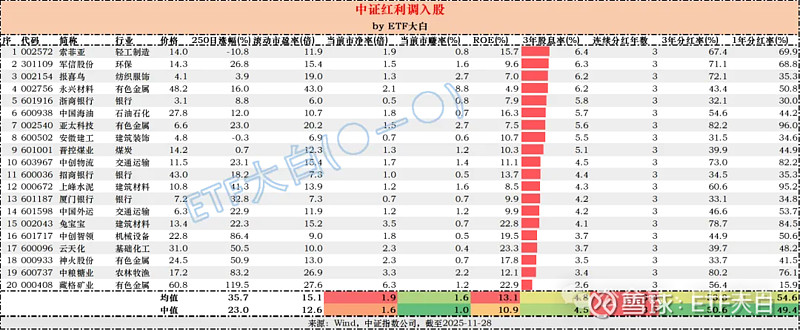 2.狂买有色,猛砍钢铁:本次新增数量最多的行业为有色金属,从1只成分股大幅增至5只;减少最多的行业为钢铁,从6只大幅压降到2只。看了一眼明细,四只有色股息率均值4.5%,高于四只钢铁的3.1%,更为重要的是,前者ROE平均为13.3%,大幅高于后者的3.7%。虽然不清楚调整细则,但显然降息周期下,有色的基本面比增长前景暗淡的重工业要强很多。此外医药生物、汽车等板块也有所减持。