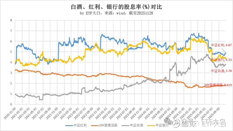 分行业来看,白酒股息率的确还是整体低于银行——即便在今年银行大涨了十几个点的情况下。事实上,白酒只有在今年7月末8月初的一瞬间,和银行几近打平(股息率4.1%左右),其余时候银行都是高于白酒的。而中证红利,用股息率加权,只能纳入更高股息率的品种,并不进行行业标准化。