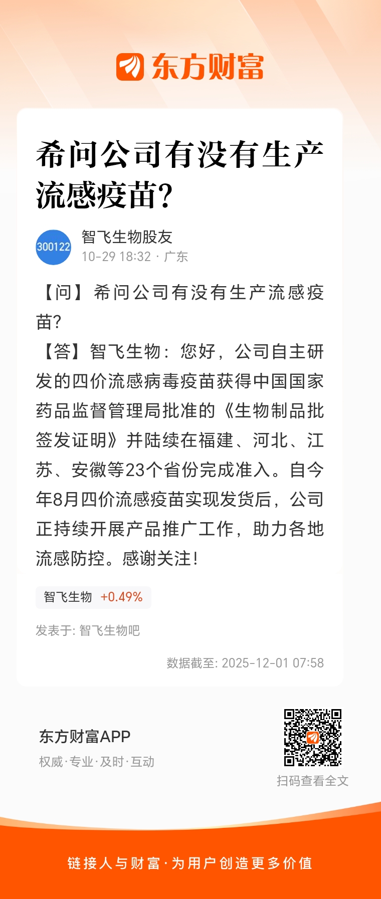 您好,公司自主研发的四价流感病毒疫苗获得中国国家药品监督管理局批准的《生物制品批签发证明》并陆续在福建、河北、江苏、安徽等23个省份完成准入。自今年8月四价流感疫苗实现发货后,公司正持续开展产品推广工作,助力各地流感防控。感谢关注!