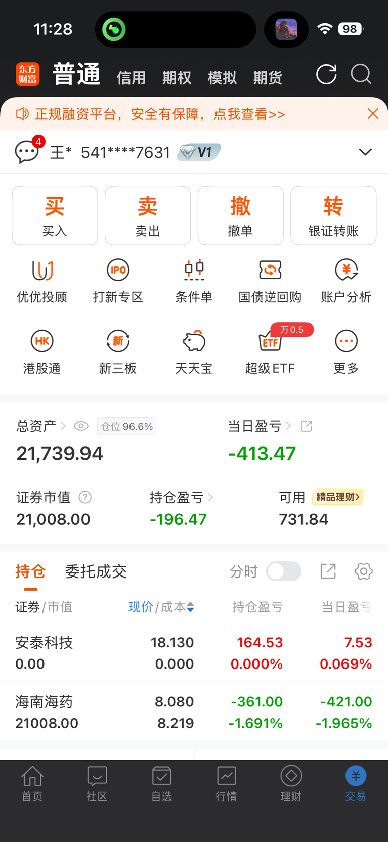 卖掉安泰科技,全仓了海南海药,早上没卖,希望下午拉红吧,今天操作有点拉垮,原本盈