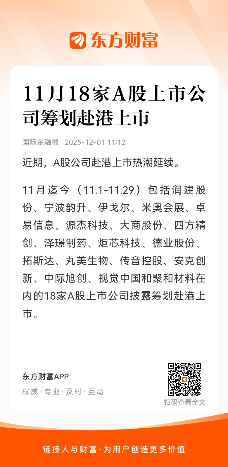 11月迄今(11.1-11.29)包括润建股份、宁波韵升、伊戈尔、米奥会展、卓易信息、源杰科技、大商股份、四方精创、泽璟制药、炬芯科技、德业股份、拓斯达、丸美生物、传音控股、安克创新、中际旭创、视觉中国和聚和材料在内的18家A股上市公司披露筹划赴港上市。
