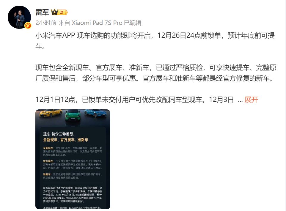 12月1日,雷军发文称小米汽车将开启现车选购。