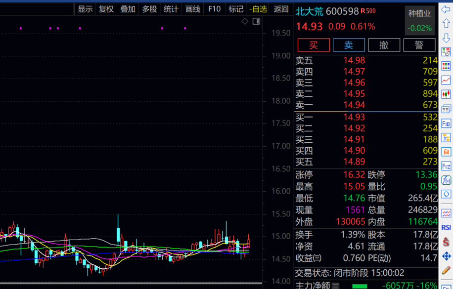 北,D,荒,继续未动, 其他新粉等新标, $北大荒(SH600598)$ $上证指数(SH000001)$