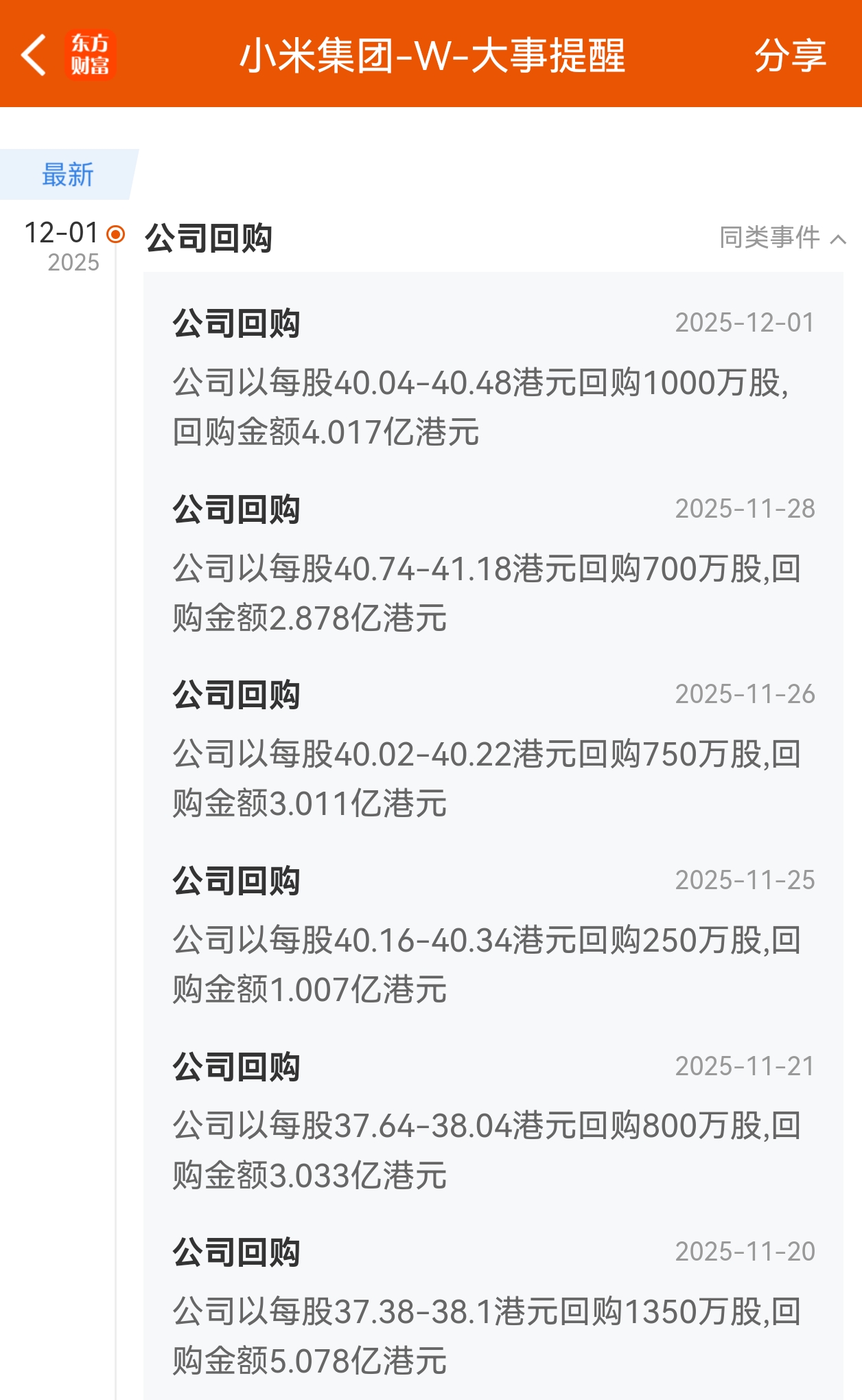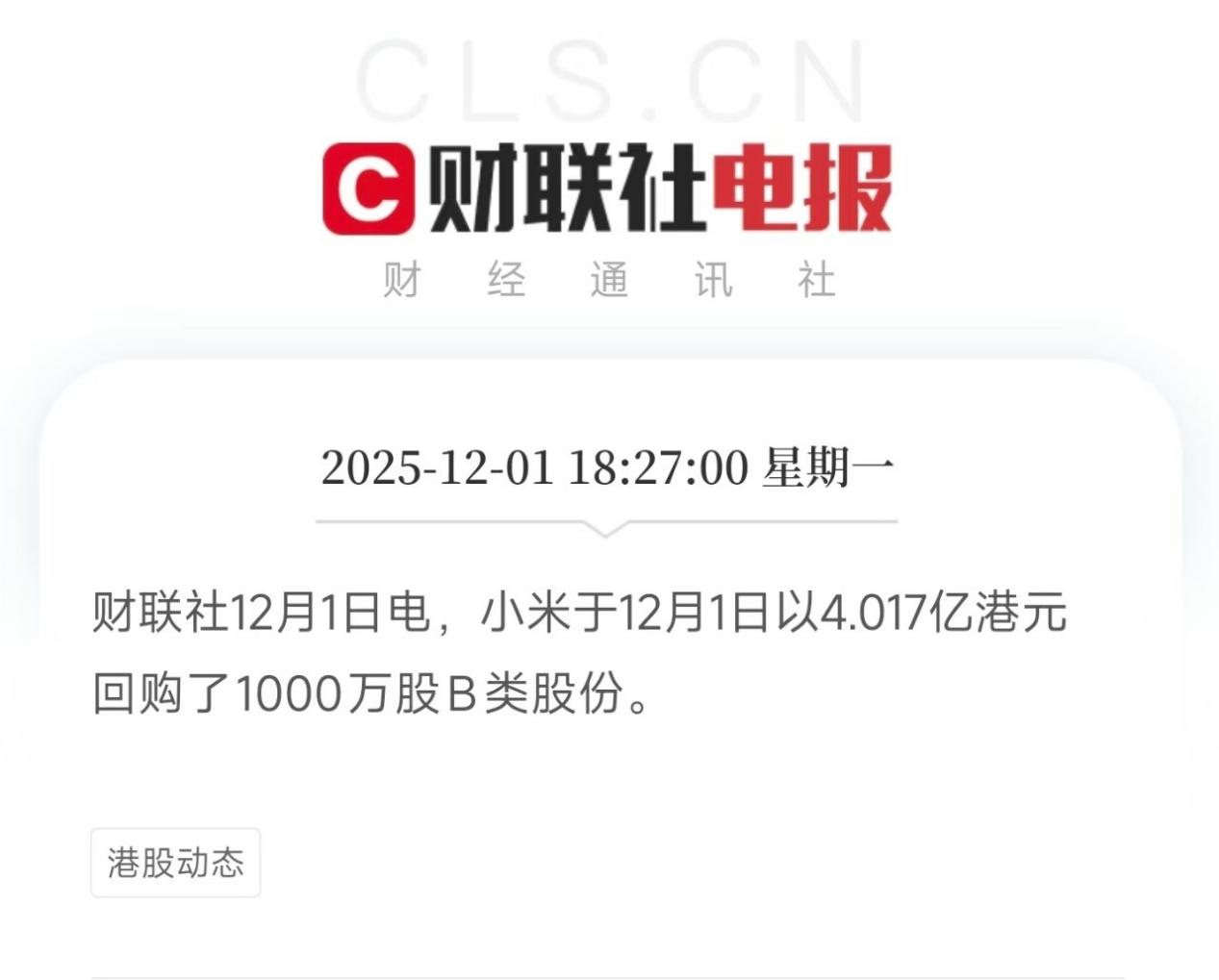 小米集团12月 1日斥资4.02亿港元回购1000万股,11月以来累计投入超19亿港元回购4850万股,这一系列密集且大额的操作绝非偶然。从资本市场逻辑来看,回购行为本质是管理层对公司当前估值的直接背书——当股价低于内在价值时,通过回购股份减少流通盘、提升每股收益,既能够向市场传递“公司价值被低估”的明确信号,也能通过真金白银的投入稳定投资者情绪。而在当前市场环境下,小米的回购更被赋予了“对抗空头”的战略意义:空头势力往往通过押注股价下跌获利,而持续的回购资金注入相当于直接对冲空头压力,彰显了管理层“护盘”的决心与资金实力。这种操作并非短期投机,19亿港元的累计投入背后,是小米对自身业务基本面的高度自信,也是对长期投资者利益的主动维护。
