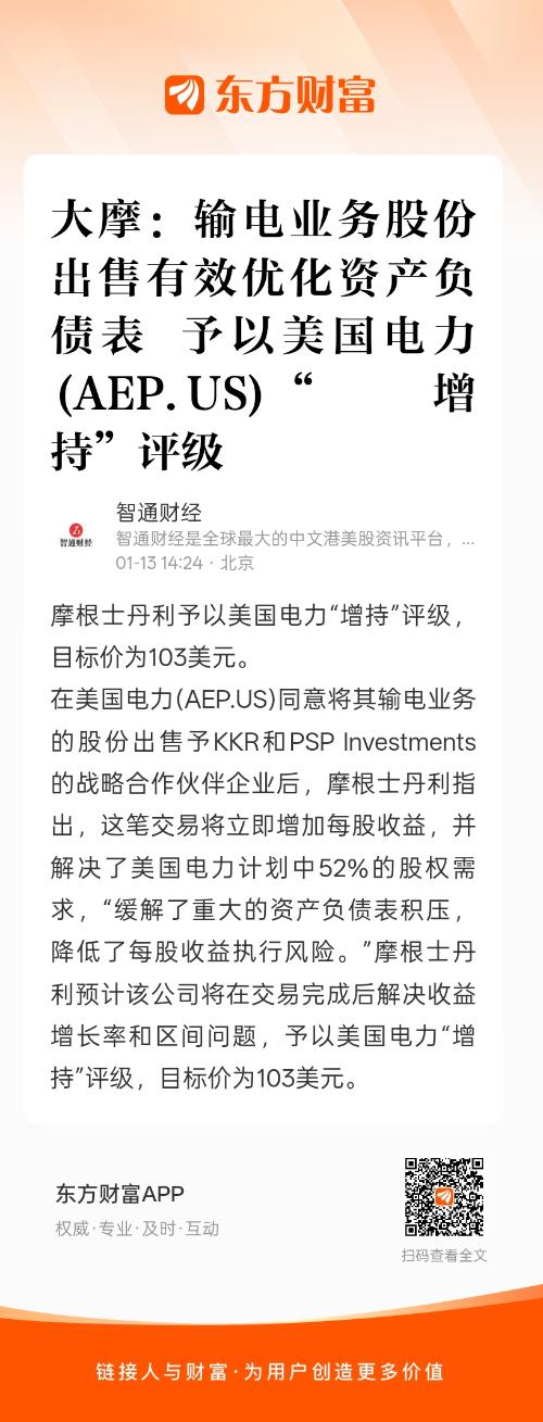 摩根士丹利予以美国电力“增持”评级,目标价为103美元。