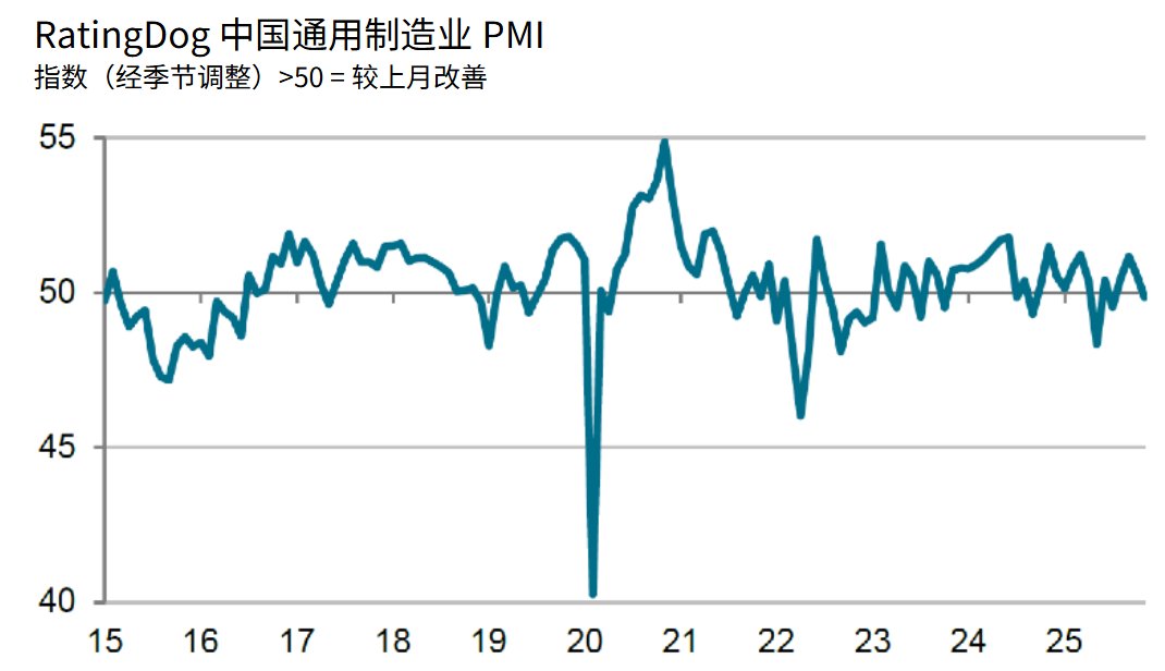 中国10月RatingDog制造业PMI录得49.9,预期50.5,前值50.6