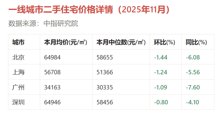 中指研究院的11月房价数据显示一线城市跌幅扩大,其中,北,上的环比跌幅超过1.2%,北,上,广的环比跌幅超过1%,和统计局口径房价近几个月显示出的趋势特征基本吻合。