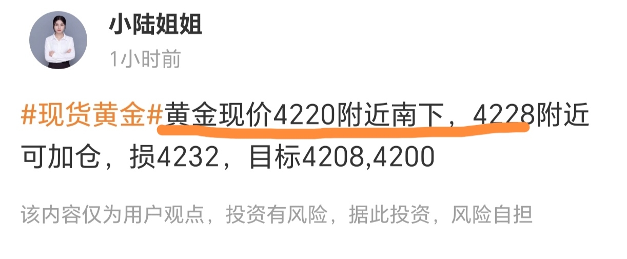 4220附近南下现在来到4216,稳健的可以先减仓推保护