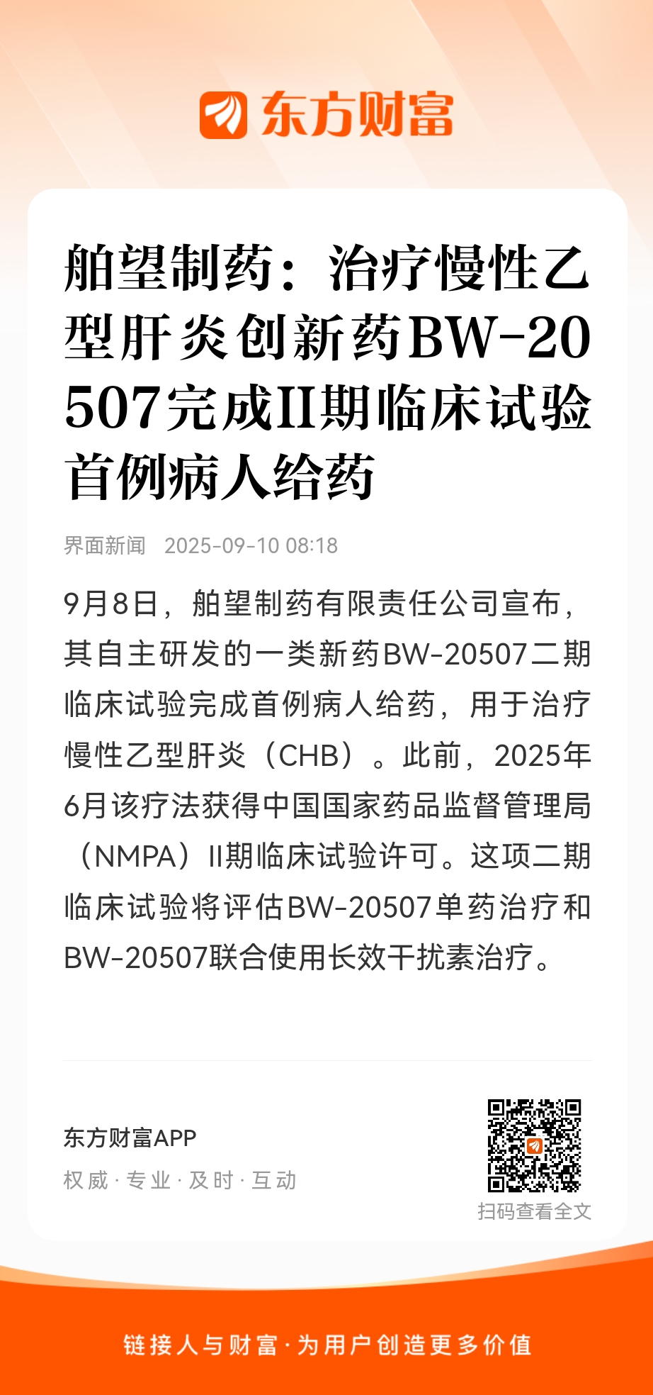 9月8日,舶望制药有限责任公司宣布,其自主研发的一类新药BW-20507二期临床试验完成首例病人给药,用于治疗慢性乙型肝炎(CHB)。此前,2025年6月该疗法获得中国国家药品监督管理局(NMPA)II期临床试验许可。这项二期临床试验将评估BW-20507单药治疗和BW-20507联合使用长效干扰素治疗。