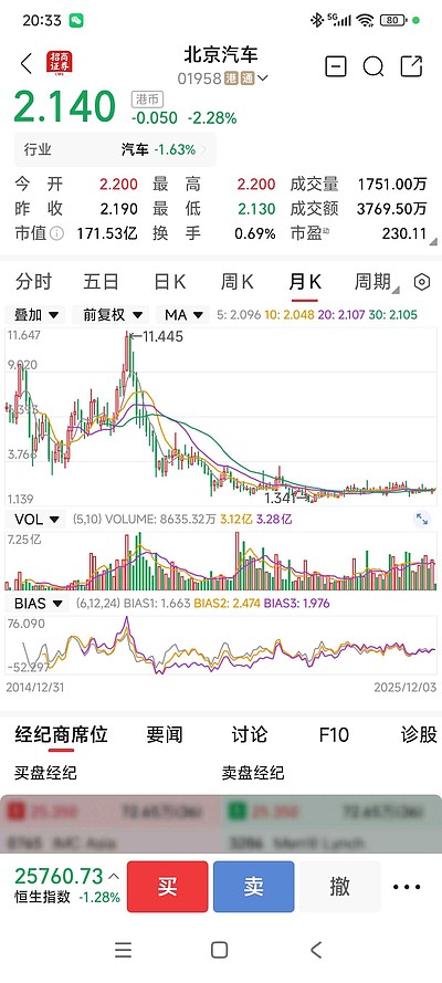 $北京汽车(01958)$ $上证指数(SH000001)$ $$东风集团股份(00489)$会不会从走东风集团股份。现在是交换筹码阶段。耐心等待,北京汽车已经5年都是1.9-2.5的窄副震荡,成本线大概2.1。其实流通筹码50亿元,很少。